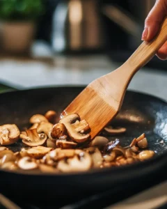 Next, add the sliced mushrooms to the skillet. Cook for about 5 minutes, stirring occasionally, until they soften and develop a slight golden-brown color. The mushrooms add an earthy depth and umami richness to the sauce. Make sure they are cooked evenly, and avoid overcrowding the pan so they don’t release too much water and become soggy.