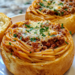 This recipe was inspired by the idea of combining two comfort food favorites into one unforgettable meal. Instead of serving garlic bread on the side, it becomes the star of the show. Hollowed bread bowls are brushed with garlic butter, toasted to perfection, then filled with saucy spaghetti and topped with gooey melted cheese. The result is a cheesy comfort explosion in every bite.