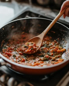 Reduce the heat to low and allow the sauce to simmer uncovered for 15 to 20 minutes. This slow simmer allows excess moisture to evaporate and gives the flavors time to meld together. Stir occasionally, scraping the bottom of the pan to prevent sticking. As it cooks, the sauce will gradually thicken and become richer in color and aroma. If the sauce seems too thick at any point, you may add a small splash of water or pasta water to loosen it.