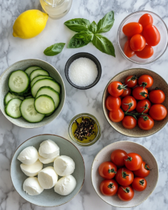 This refreshing cucumber mozzarella salad combines crisp cucumbers, creamy mozzarella, juicy tomatoes, and fresh basil in a light lemon olive oil dressing.